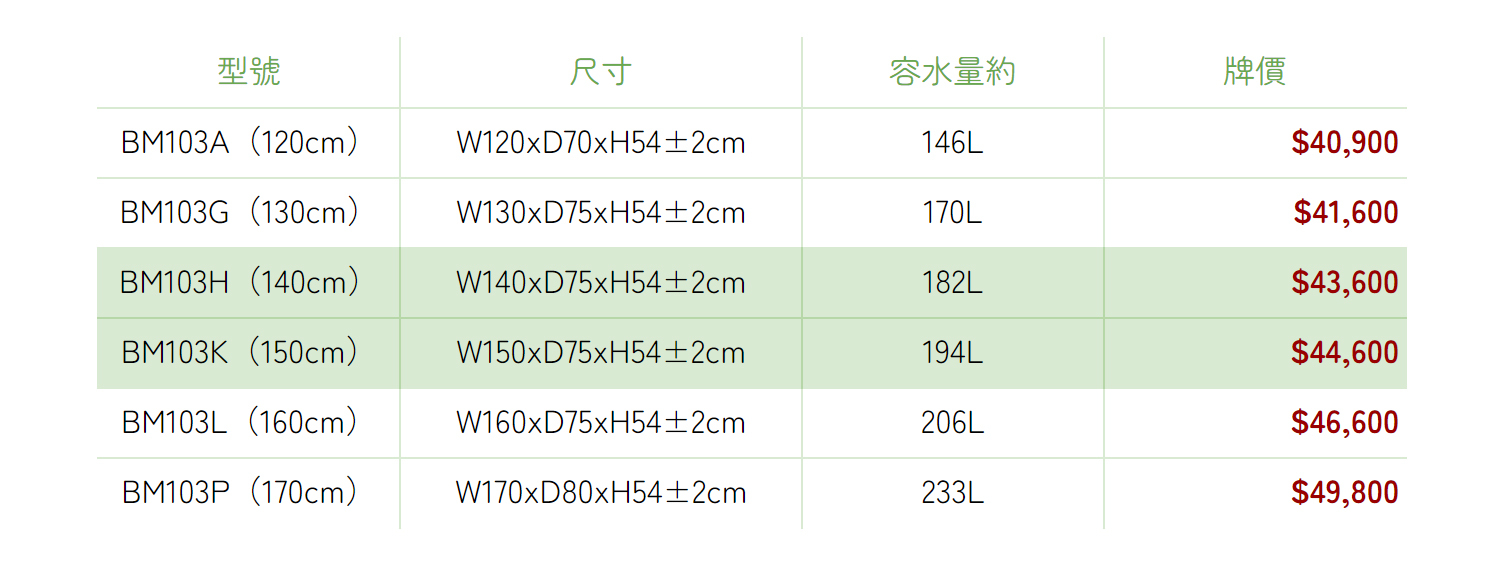 *W140cm 以上之空缸及按摩浴缸另含浴缸把手