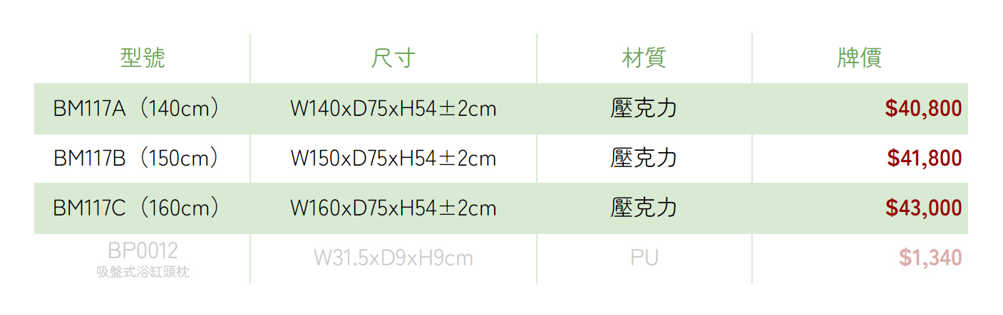 *按摩浴缸均含電子式開關、旋轉式落水口組及銅鍍鉻不積水噴頭組。