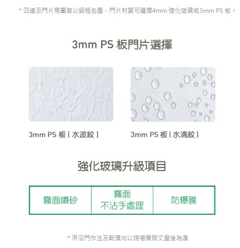 *玻璃材質:可選擇 4mm 清透強玻或 3mm PS板 ( 水滴或水波紋 )
