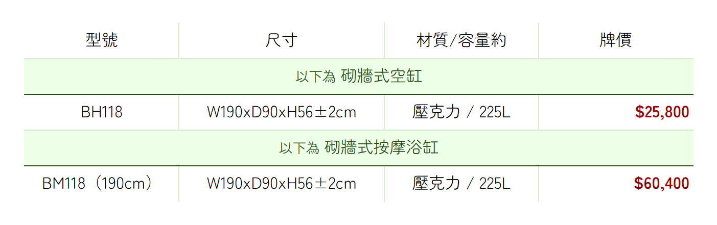 *按摩浴缸均含電子式開關、旋轉式落水口組及銅鍍鉻不積水噴頭組。
