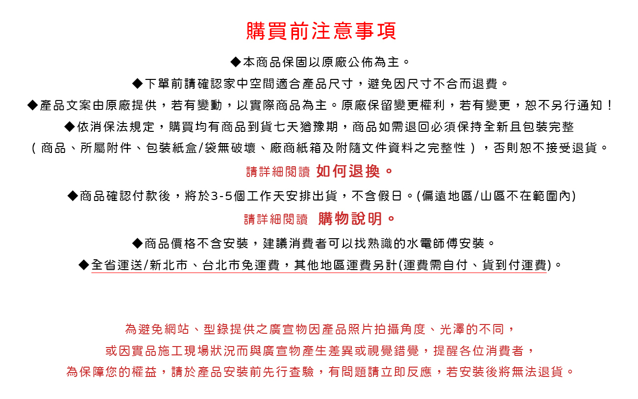 • 新北市/台北市衛浴免運費(電料燈具商品需滿$3,000免運費)