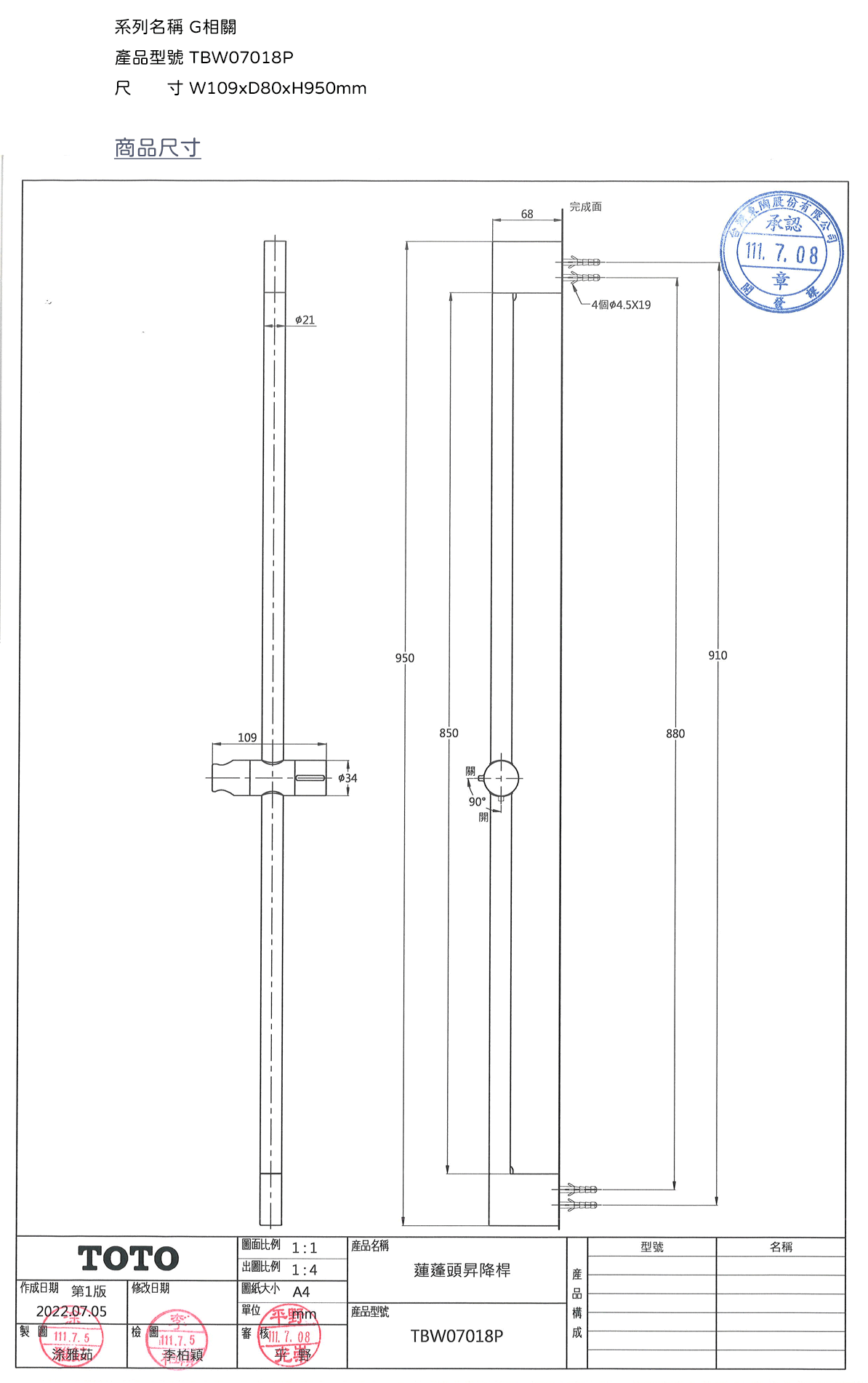 尺 寸 W109xD80xH950mm