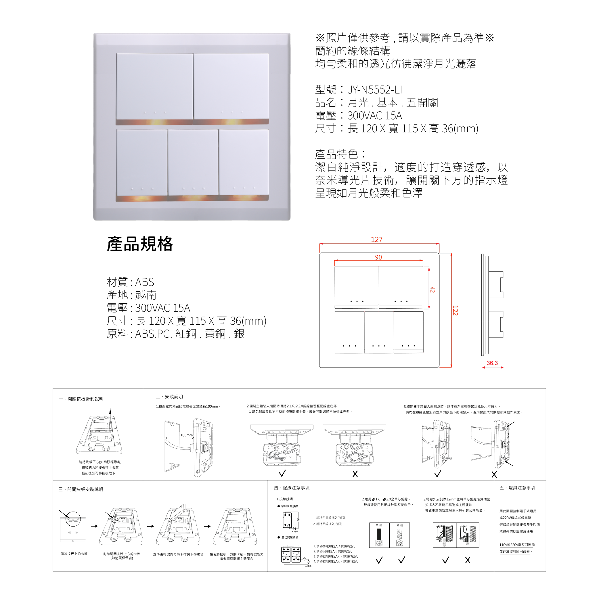 中一 月光基本款/五開關蓋板組 JY-N5552-LI