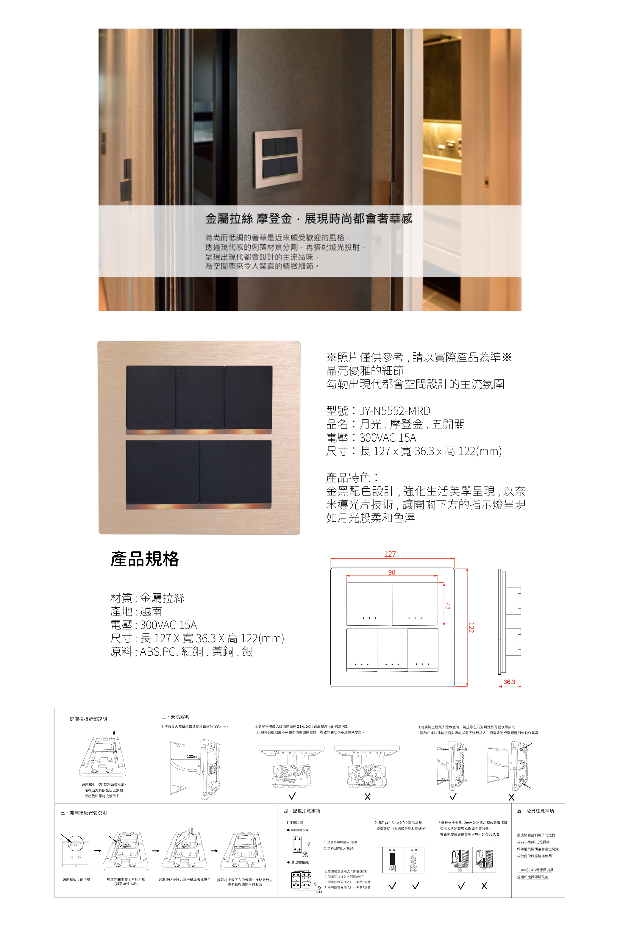 中一 月光系列摩登金-五開關蓋板組 JY-N5552-MRD