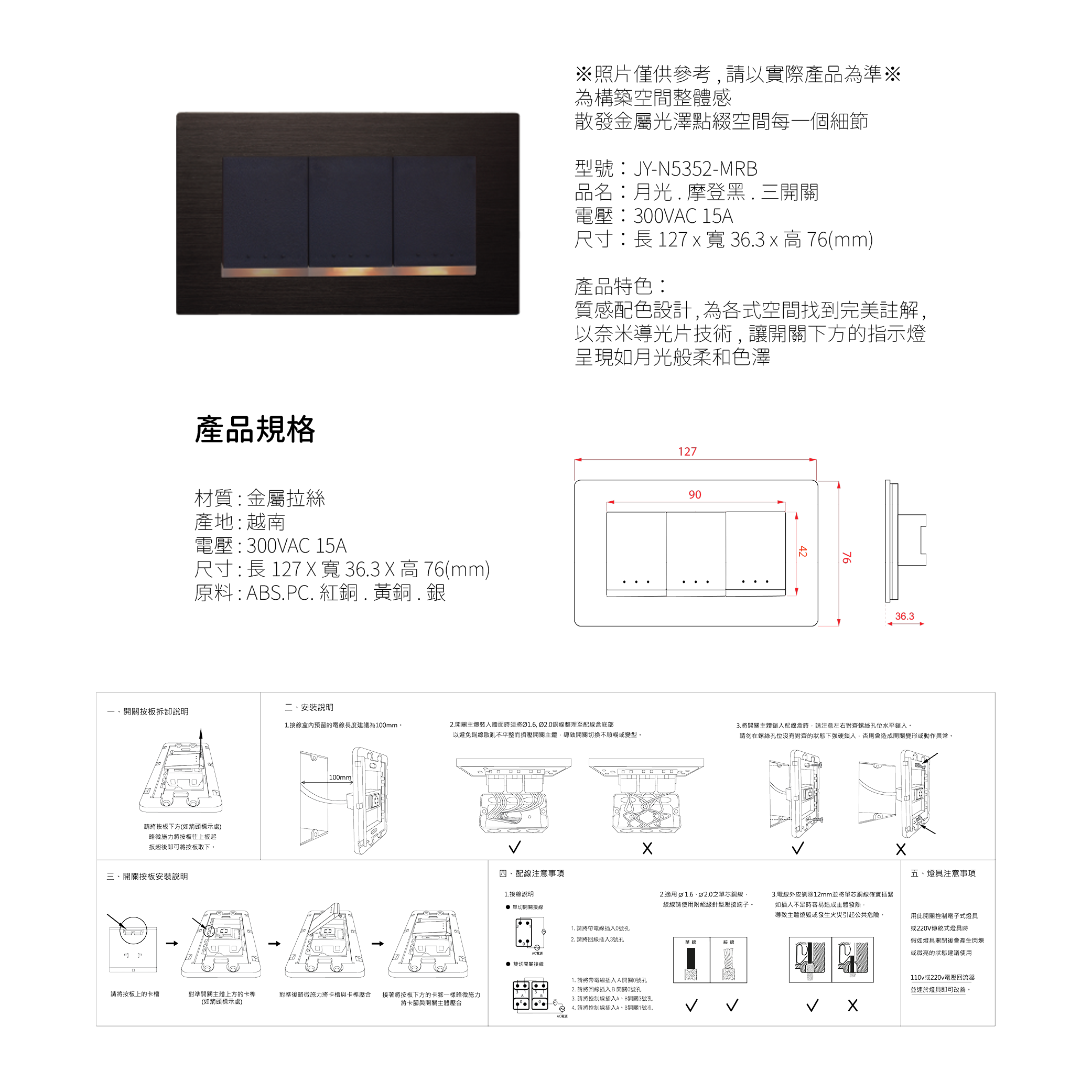 中一 月光系列摩登黑/三開關蓋板組 JY-N5352-MRB