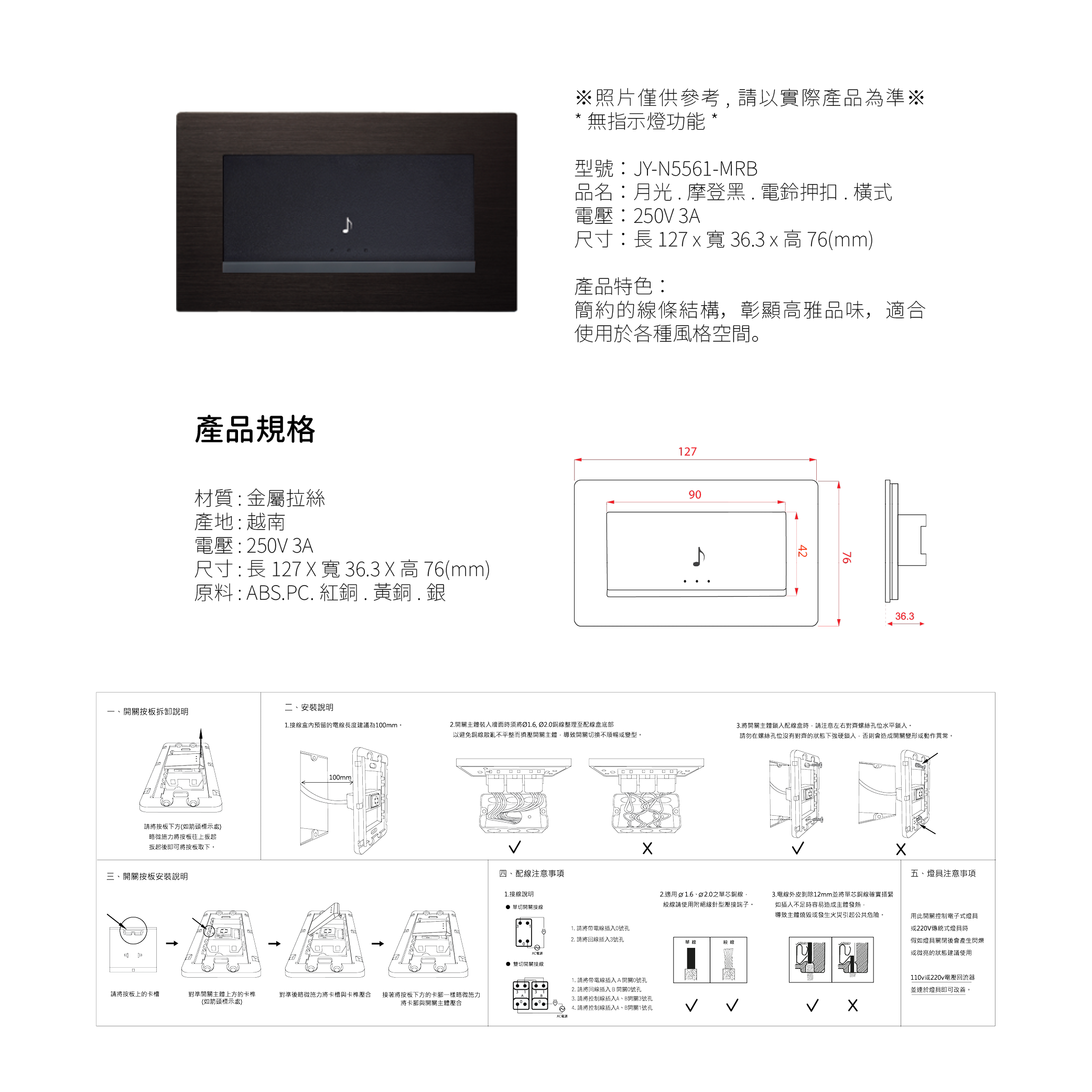 中一 月光系列摩登黑/電鈴押扣蓋板組(橫式) JY-N5561-MRB