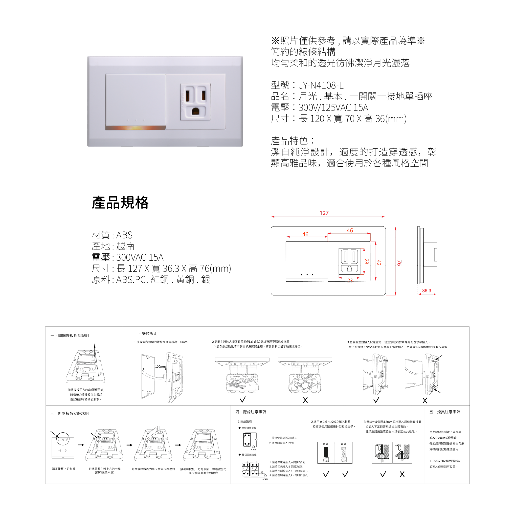 中一 月光輕觸款/一開關一接地單插座蓋板組 JY-N4108-LI