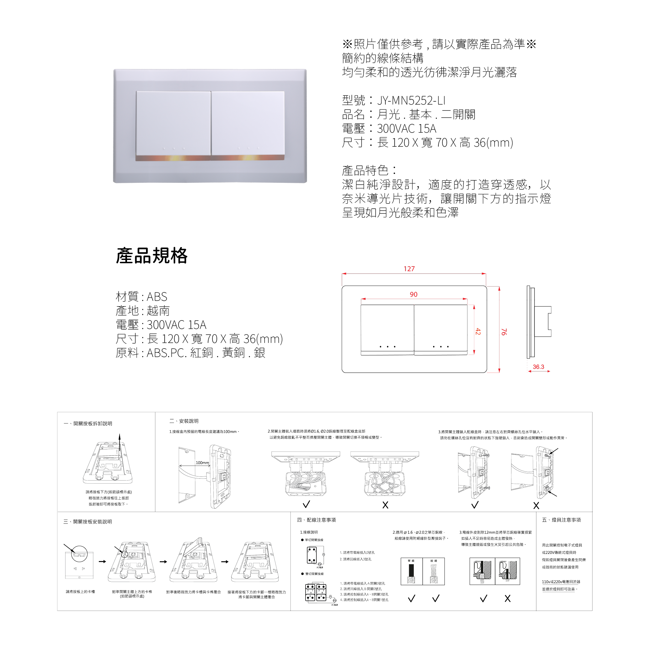 中一 月光輕觸款/二開關蓋板組 JY-MN5252-LI