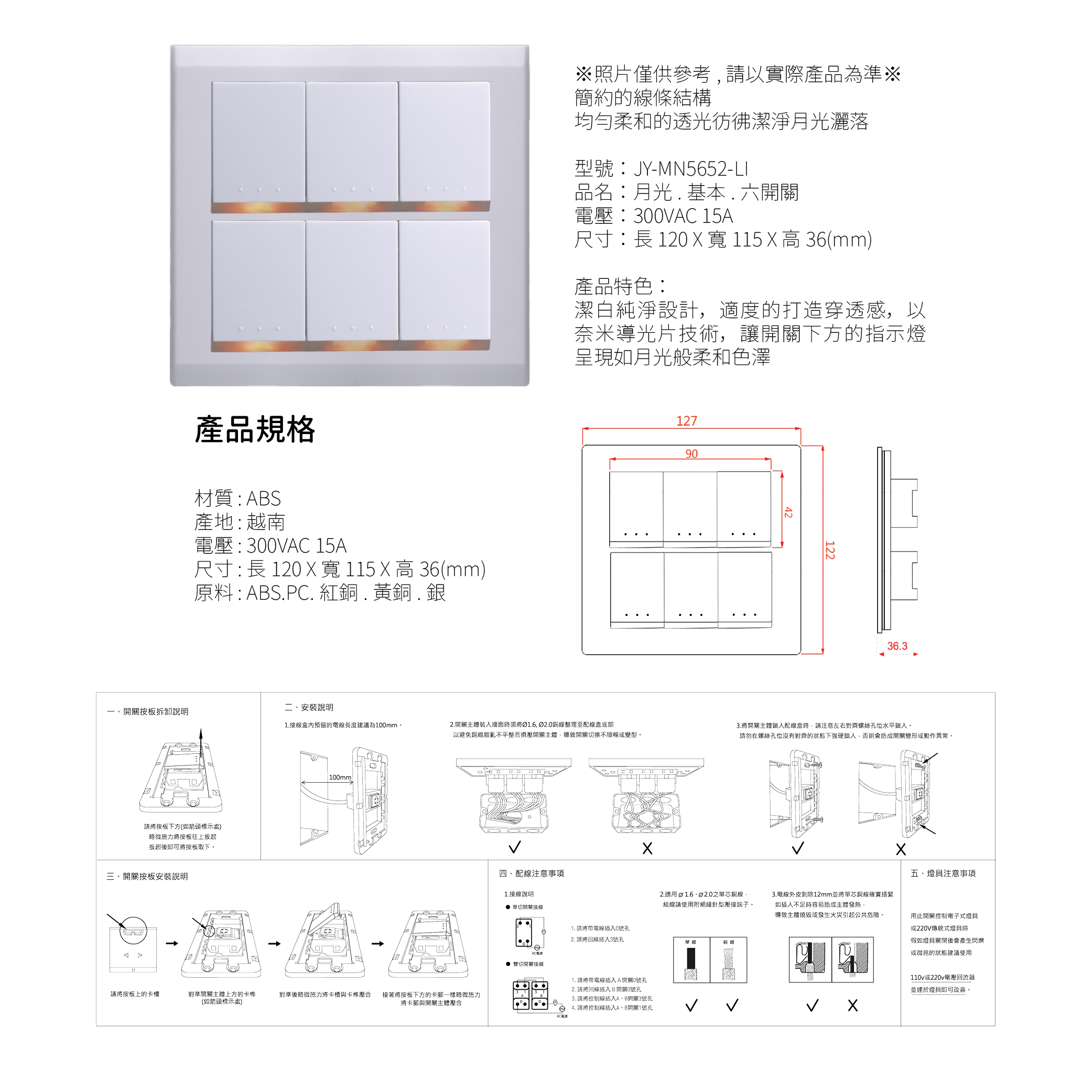 中一 月光輕觸款/六開關蓋板組 JY-MN5652-LI