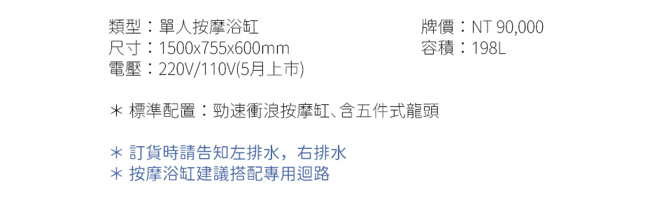 恆潔衛浴 浴缸推薦型號 HLB623CRS3-151 單人按摩浴缸 *